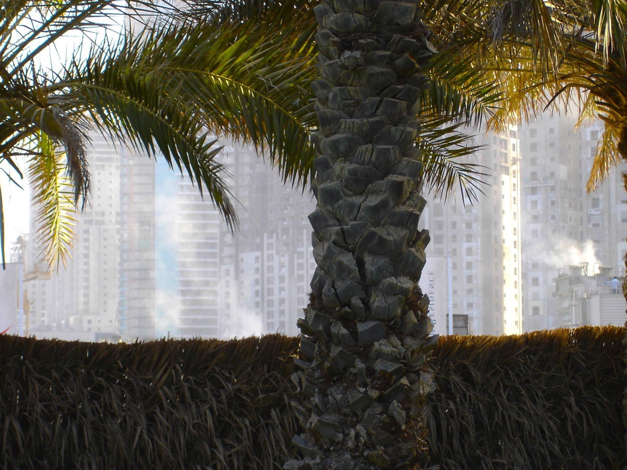 Building construction seen through palm fronds