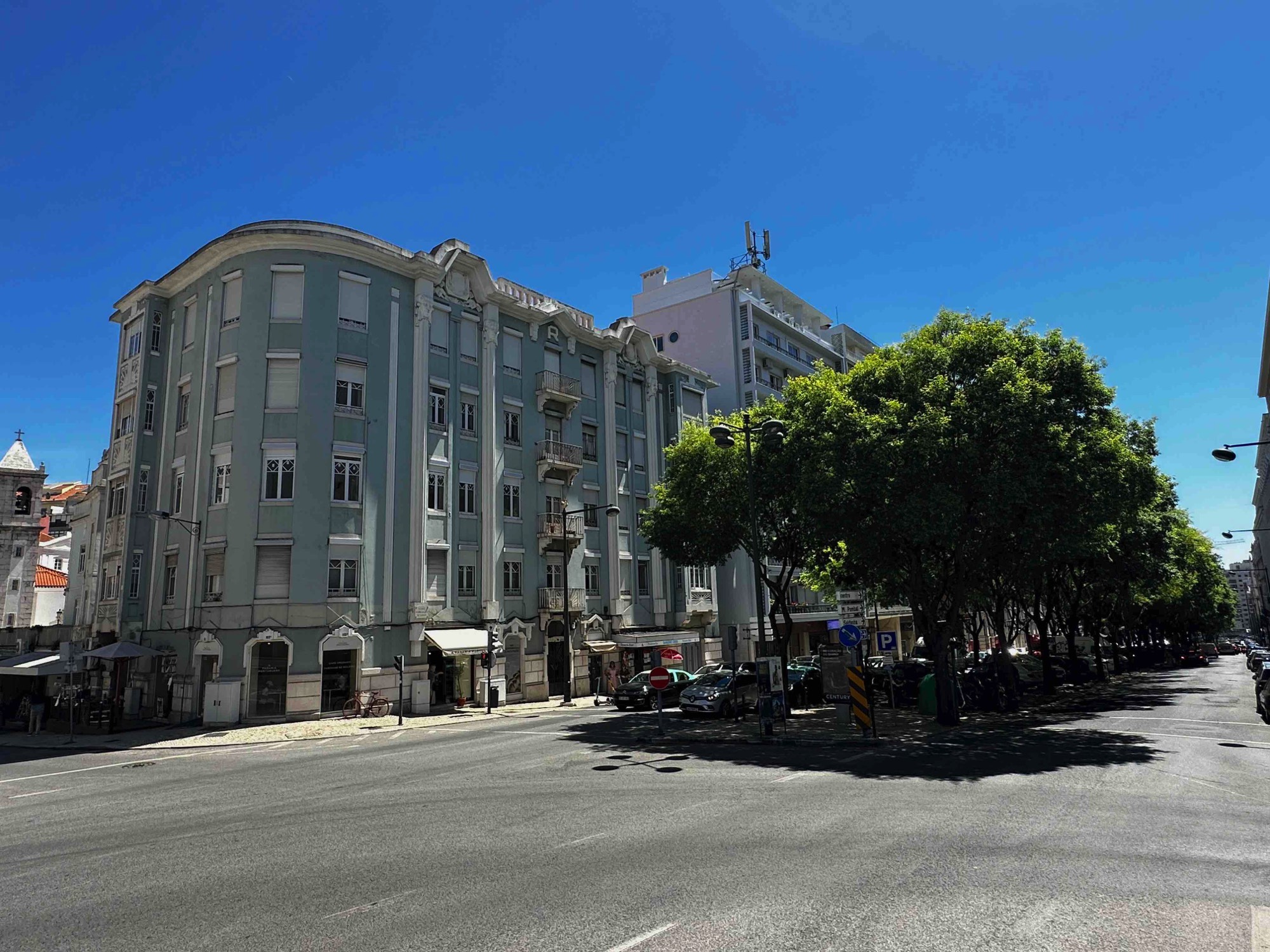Preserved old buildings and tree-lined median in Avenidas Novas parish