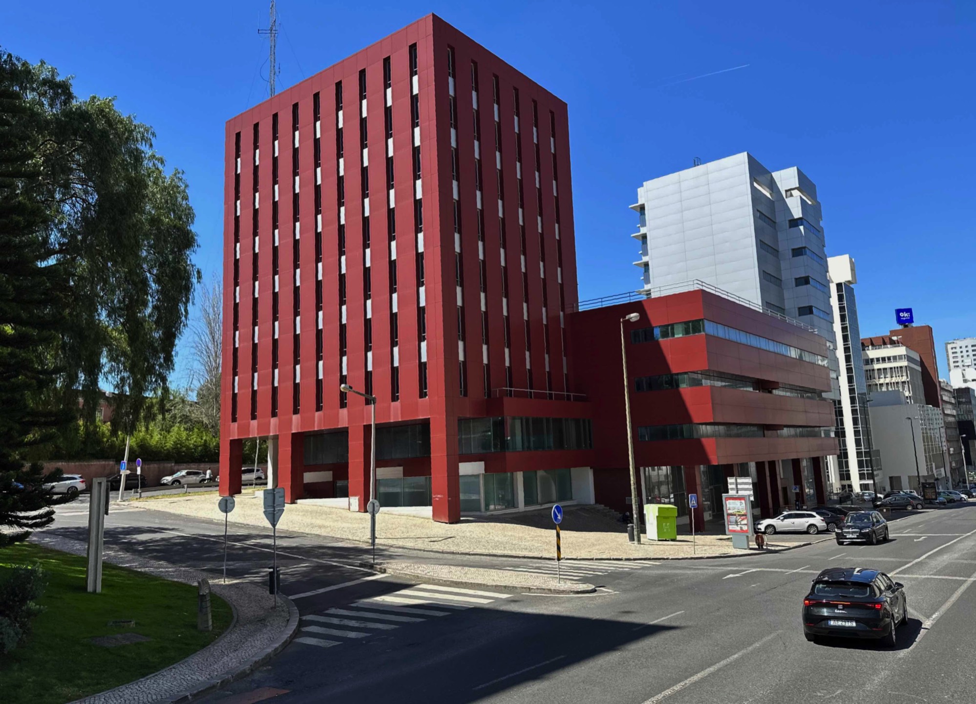Modern red building near Praça de Espanha