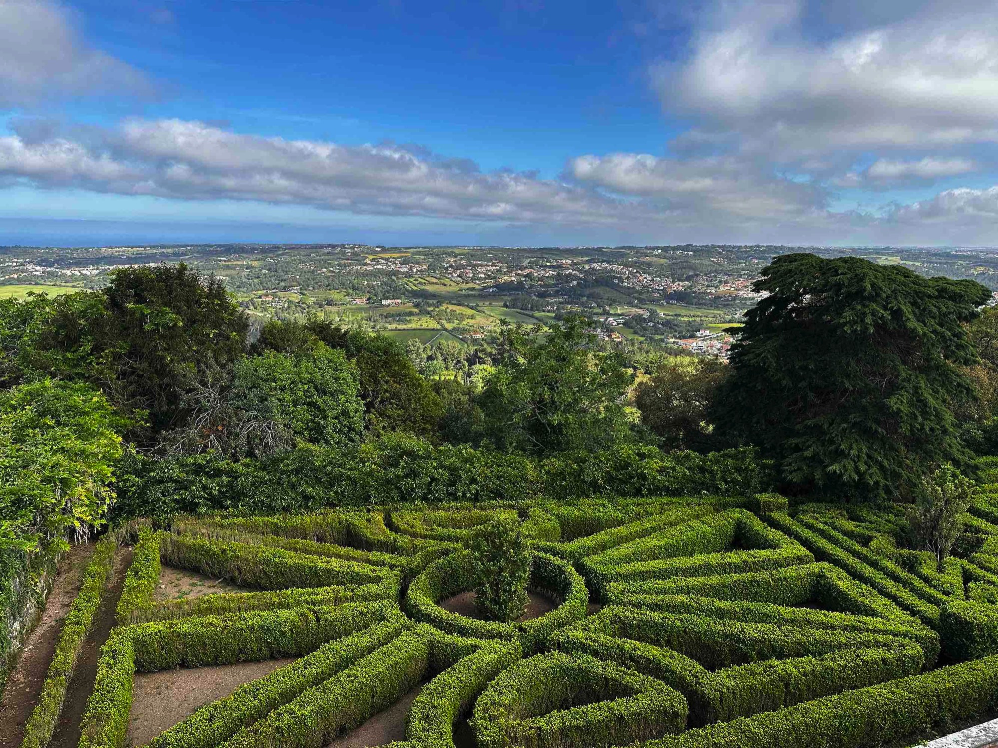 A parterre in the Seteais Palace Garden with a view of the town of Sintra below