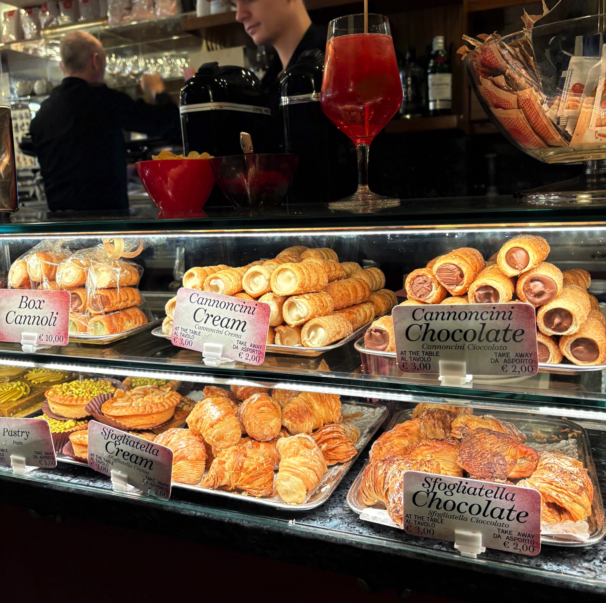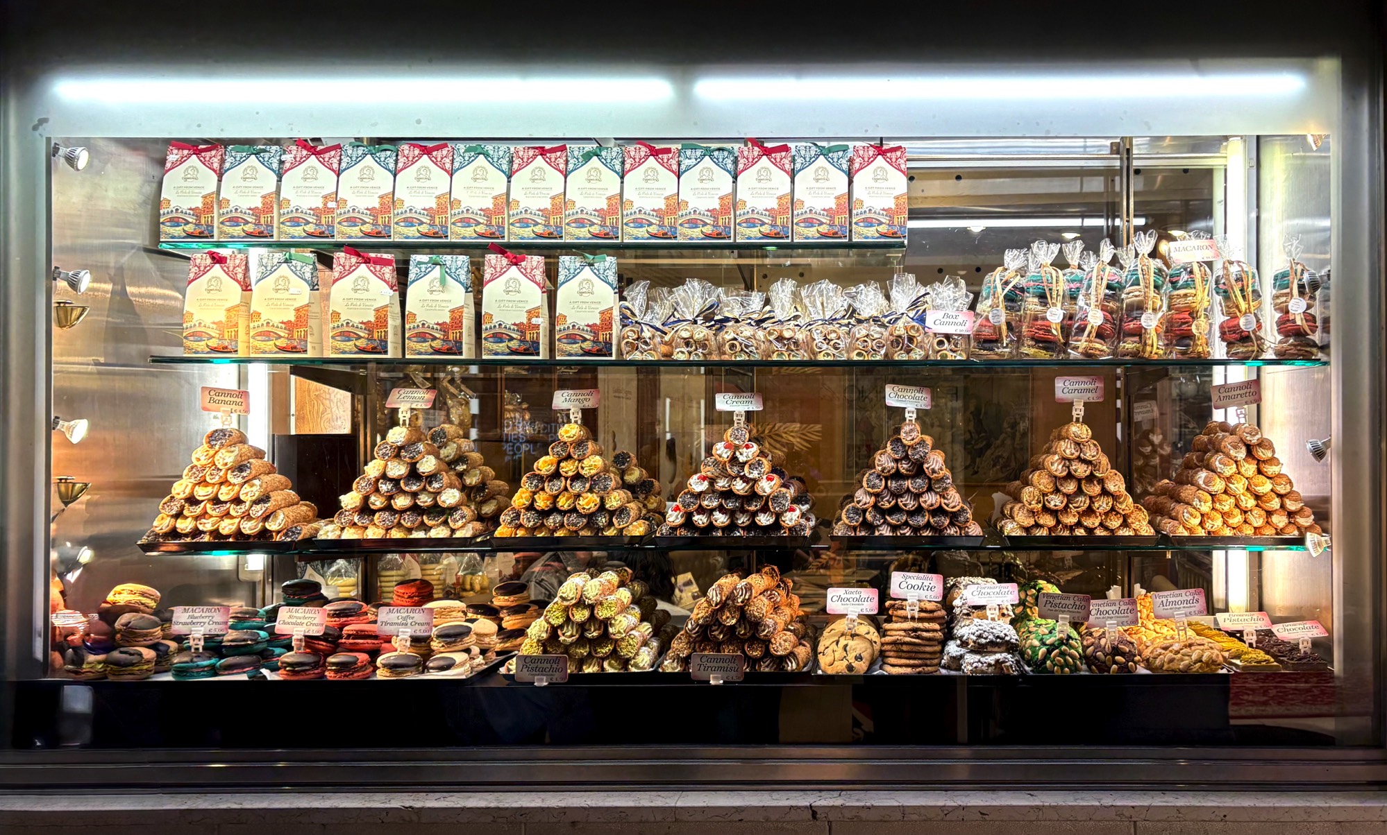 Display of cannoli and other pastries in a Venetian pastry shop window
