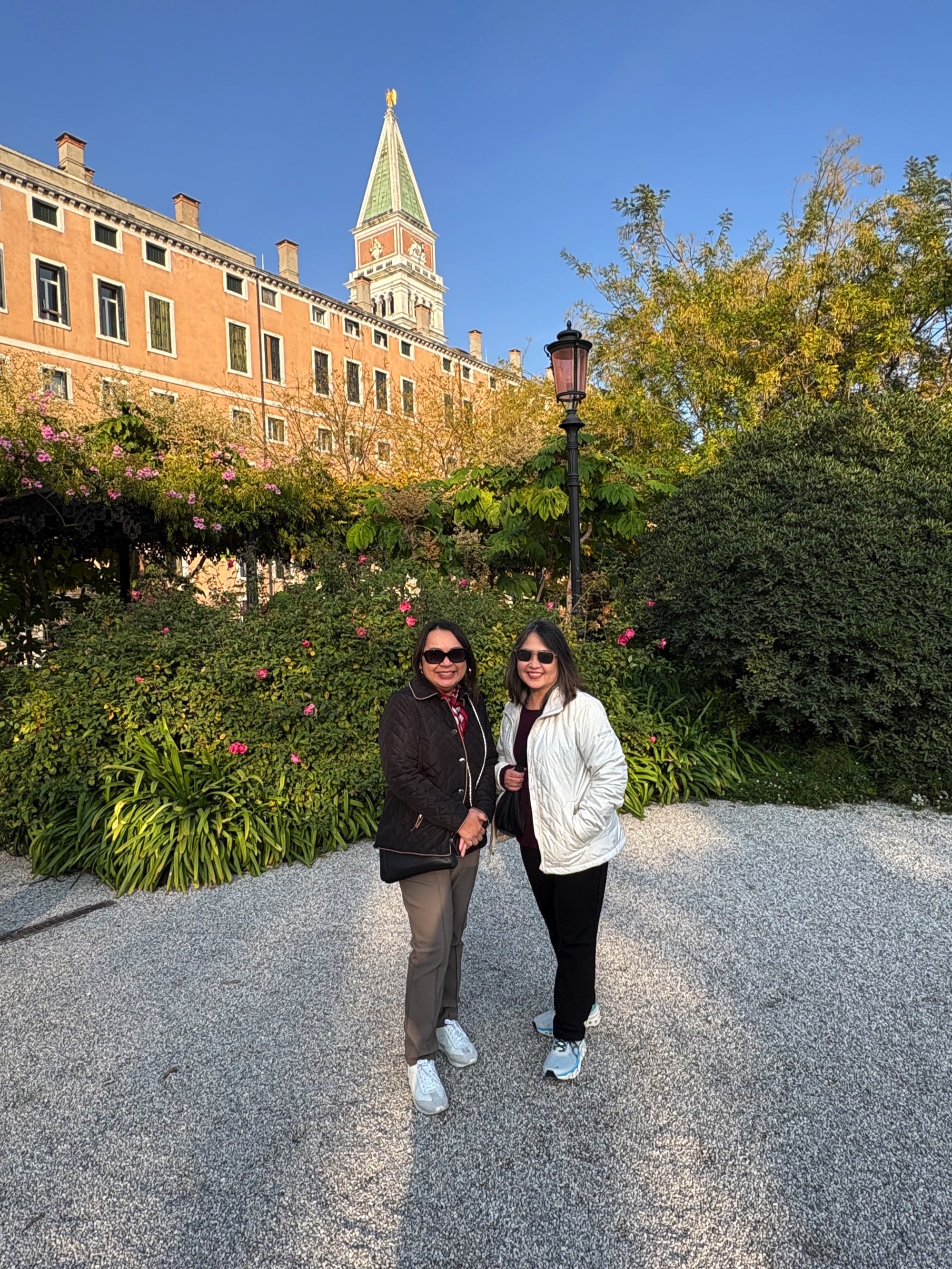 Leah and Joe An in the Giardinetti Reali (Royal Garden) of Venice with the spire of St. Mark's bell tower in the background