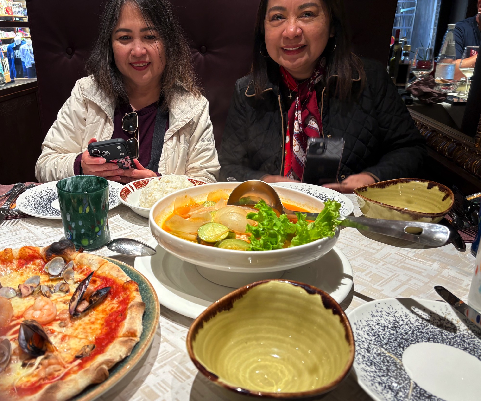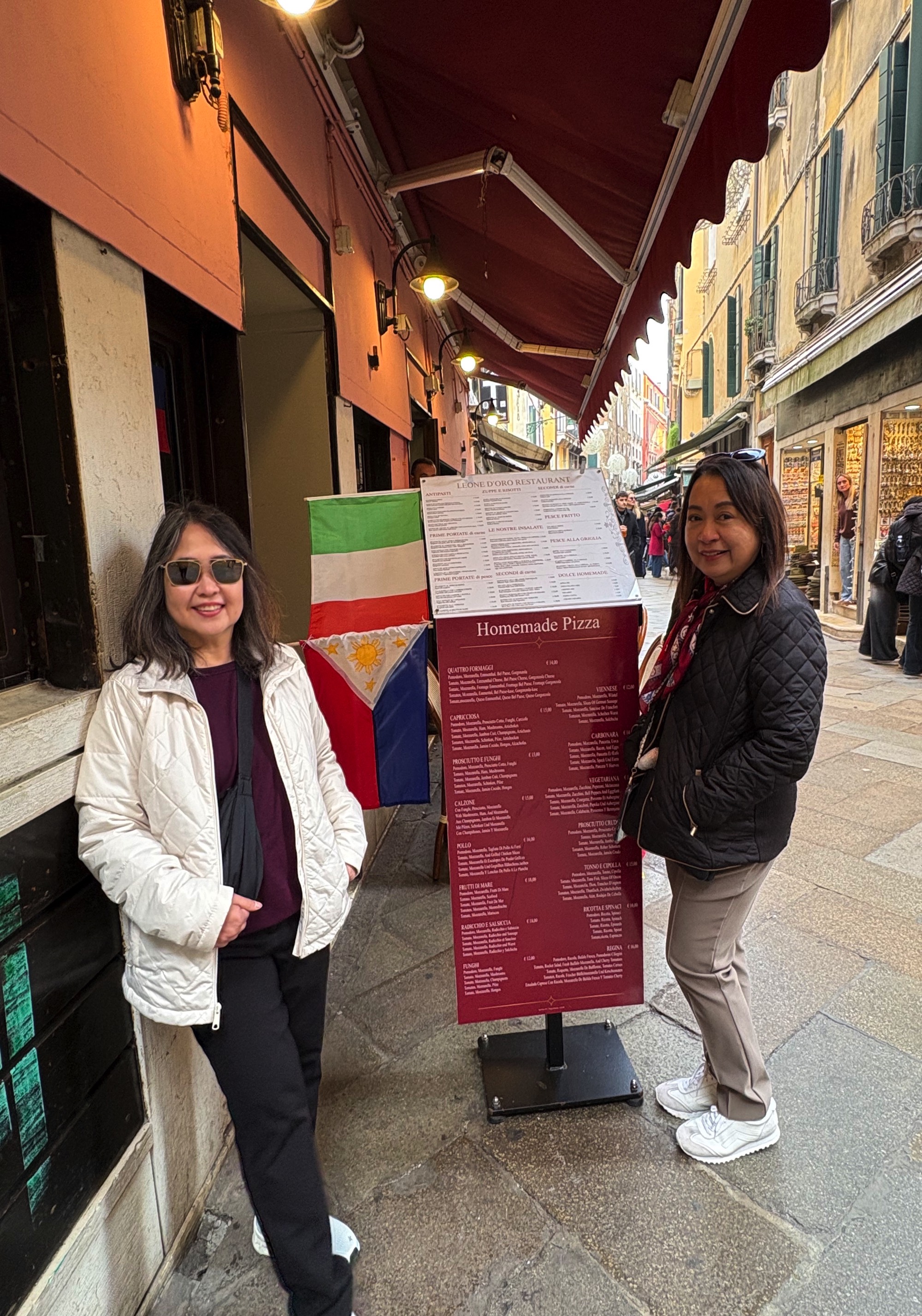 Joe An and Leah served with pizza and Filipino food in a Venetian restaurant